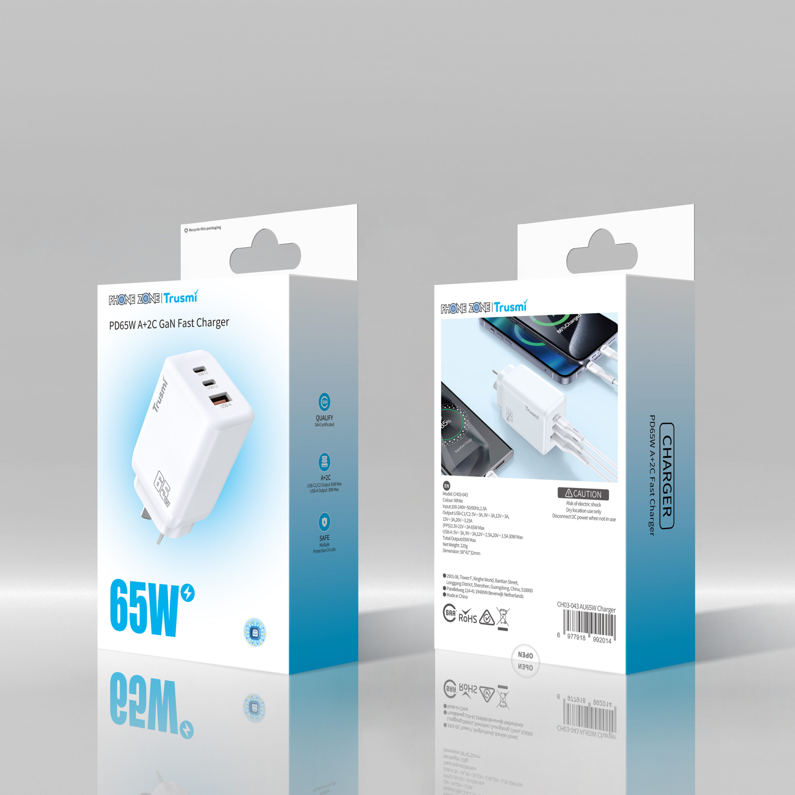 Phone Zone PD 65W Wall Charging Adapter A+C+C GaN AU/NZ CH03-043