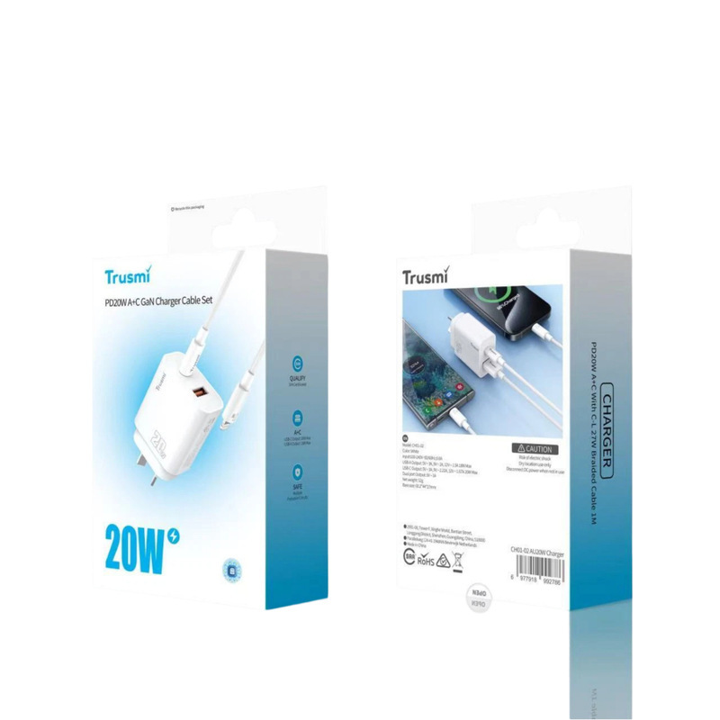 Trusmi Charger Combo 20W Wall Charging Adapter A+C & 27W C to L Braided Cable 1M White CH01-02